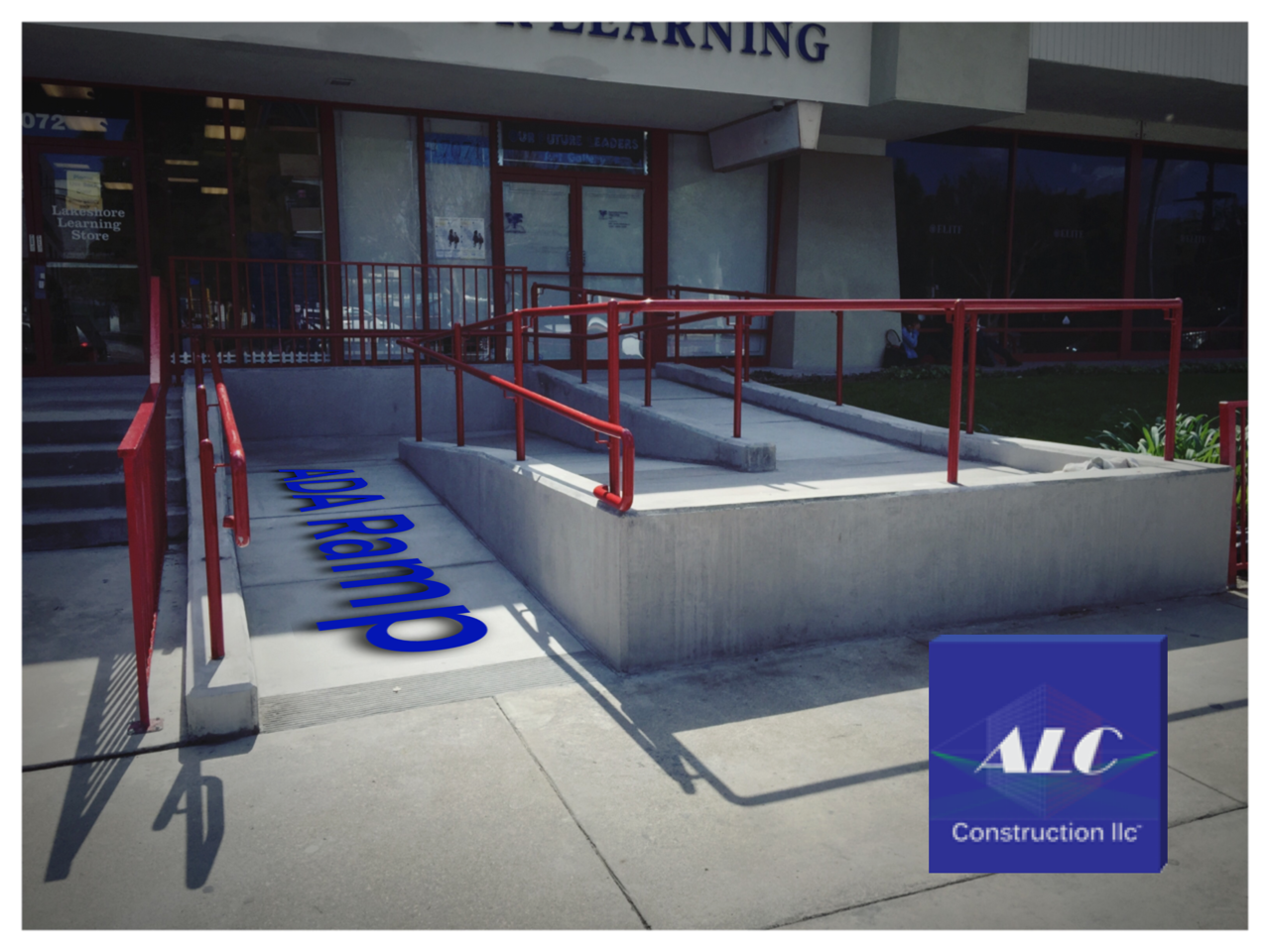 ALC Construction ADA ramp has 4 landings, one at the bottom, one at the top and 2 intermediate. All landing have 5′ clearance for change of direction and a slope less the 2% in every directions. The slope in between landing is under 8.3% in the direction of travel with a cross slope of les than 2%. A continues handrail was install with P on top and bottom of 12″ min.ALC Construction